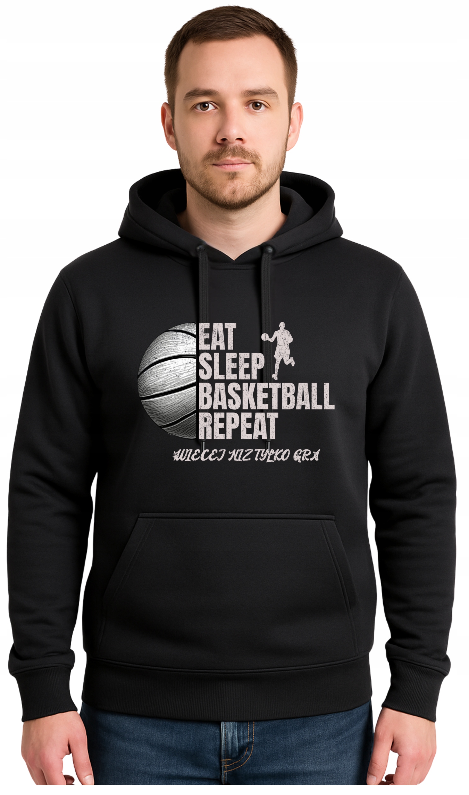 BASKETBALL EAT SLEEP Czarna Męska Bluza Dresowa z kapturem z Nadrukiem