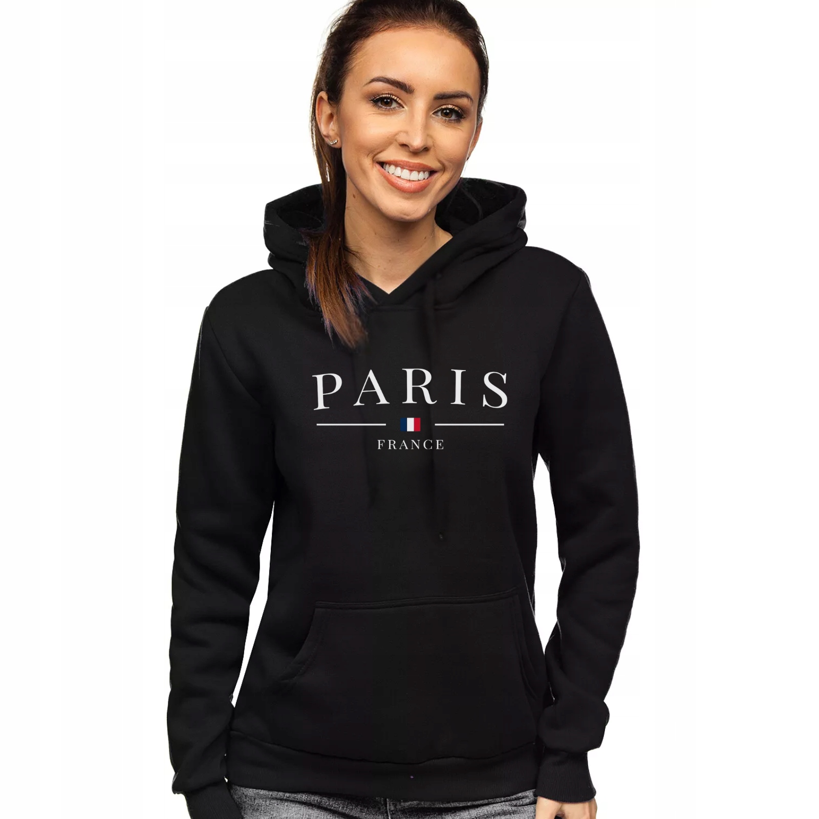 PARIS FRANCE CZARNA DAMSKA BLUZA Z KAPTUREM Z MODNYM NADRUKIEM